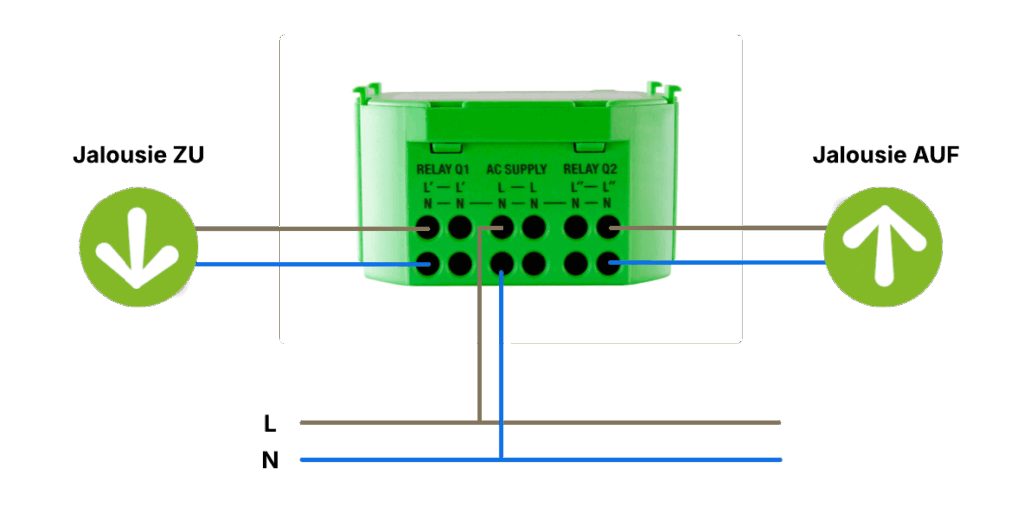 Jalousiemotor verbinden Die zwei integrierten Relaisausgänge steuern deinen Jalousiemotor: